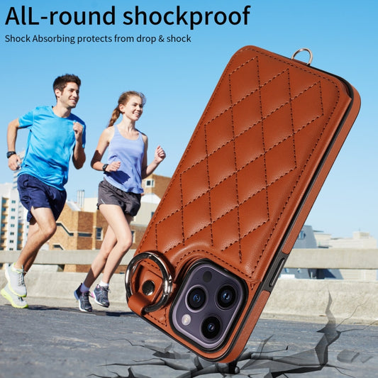 Für iPhone 14 Pro Max Rhombic Texture Card Bag Handyhülle mit kurzem Umhängeband (braun)