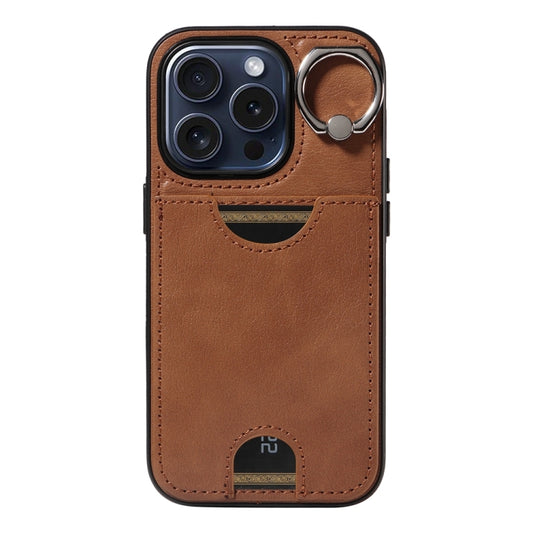 For iPhone 15 Pro Calf Texture Card Slot Ring Holder Phone Case (Brown)