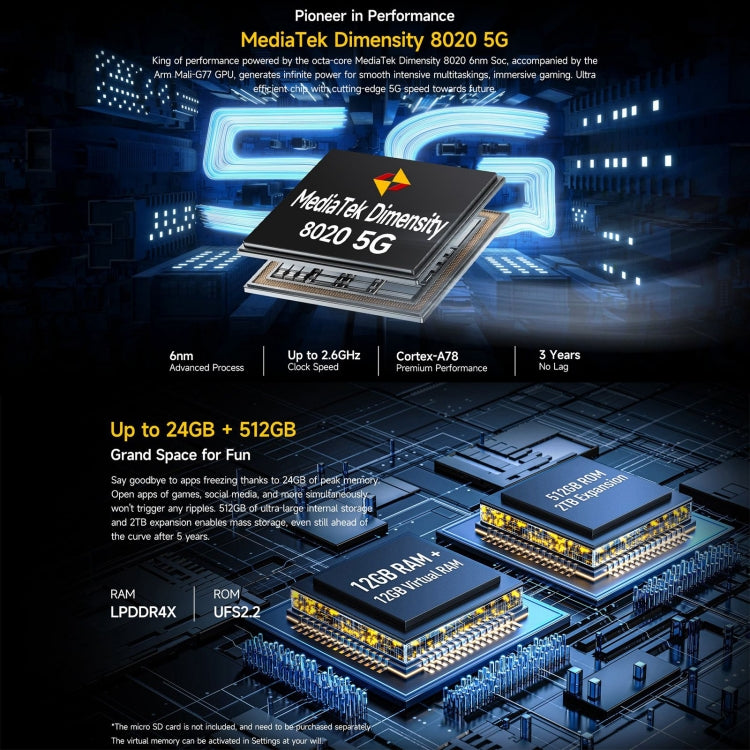 1. CPU: MediaTek Dimensity 8020, Octa-core up to 2.6GHz, 4 x Arm Cortex-A78 + 4 Arm x Cortex-A55